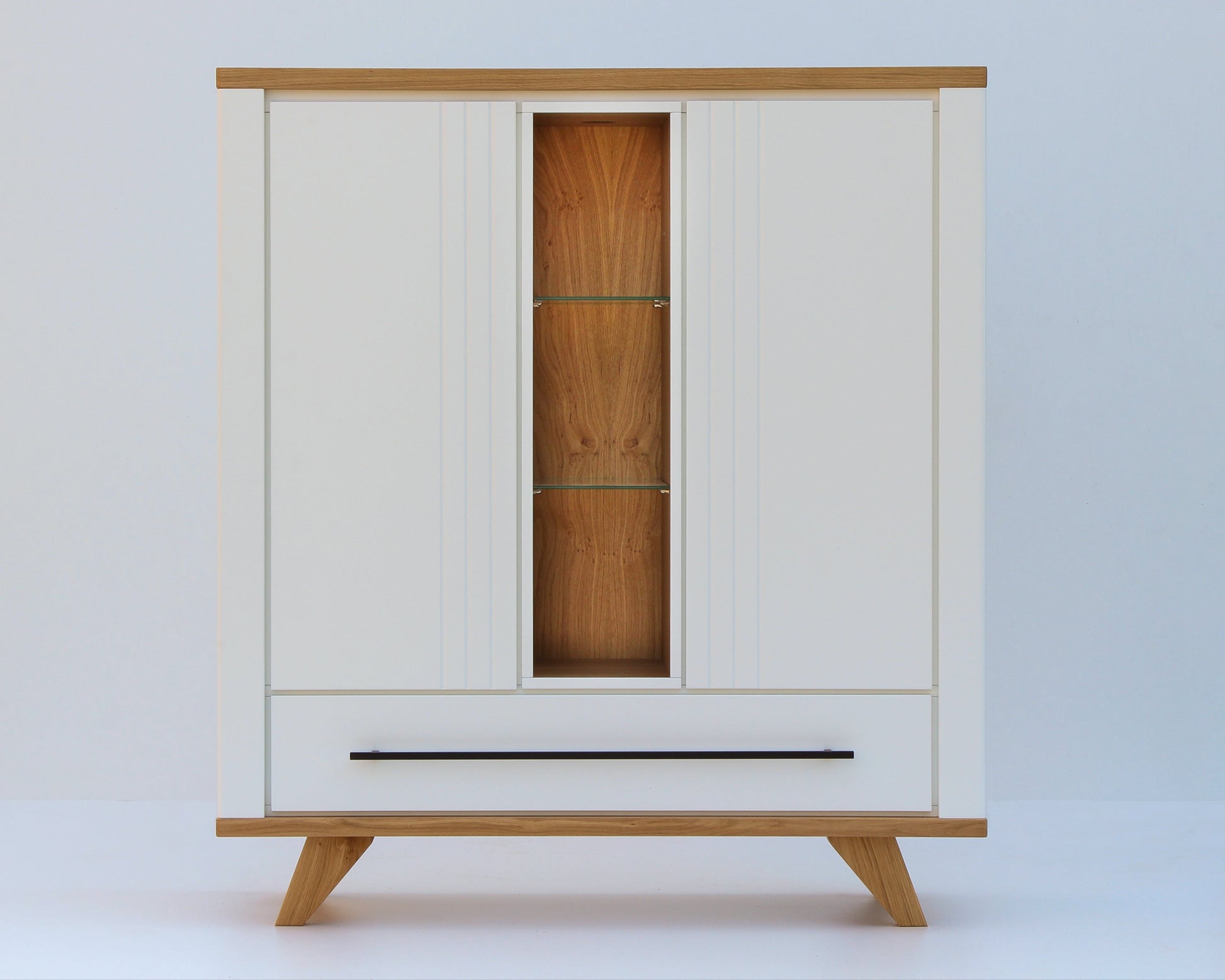 Das Highboard vereint klare Linien mit einer harmonischen Materialwahl. Die mittige, offen gestaltete Vitrine mit Glasböden und Eichenrückwand setzt stilvolle Akzente und bietet Platz für dekorative Lieblingsstücke. Die mattweißen Fronten schaffen Ruhe und Leichtigkeit im Raum, während die natürlich gemaserten Holzelemente für Tiefe und Charakter sorgen.