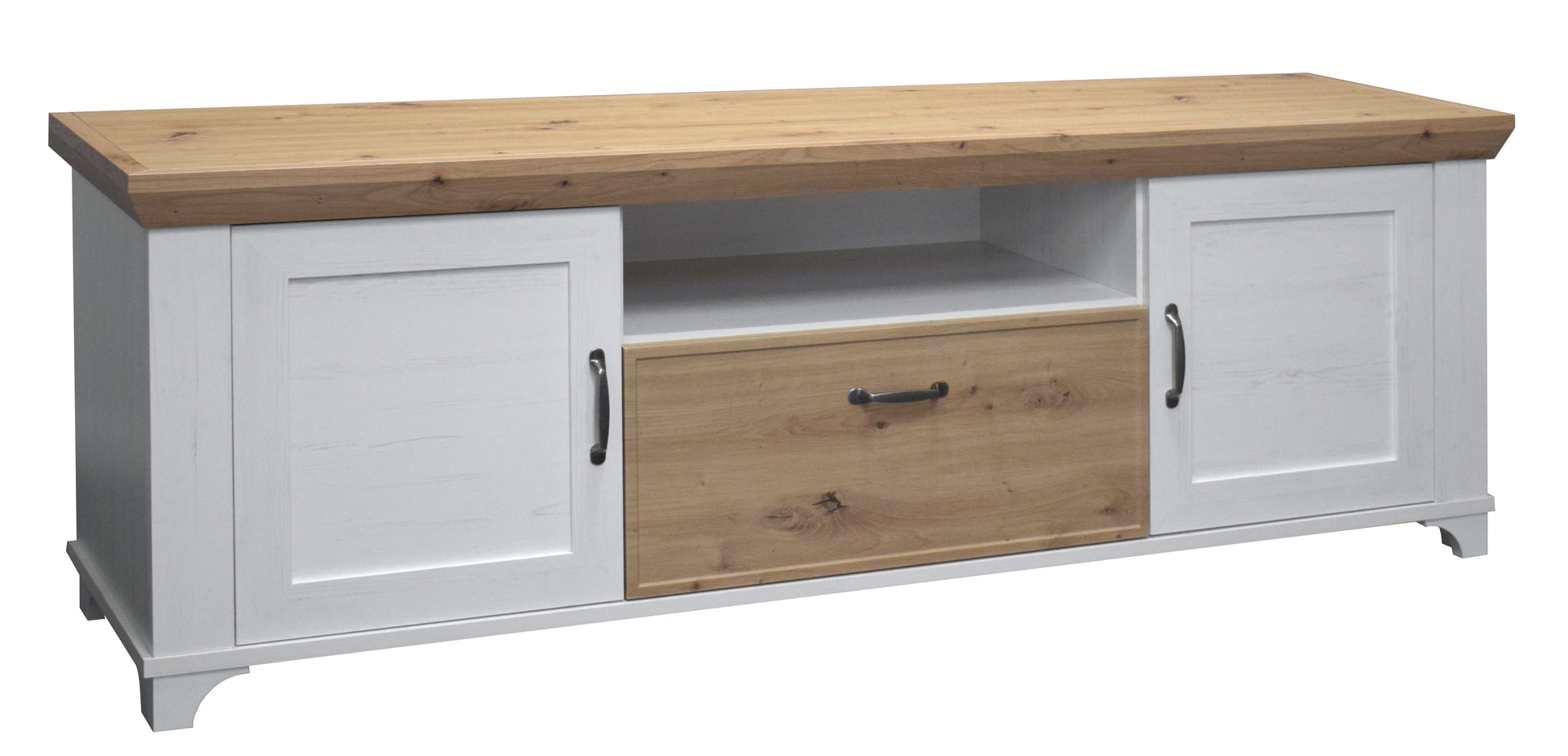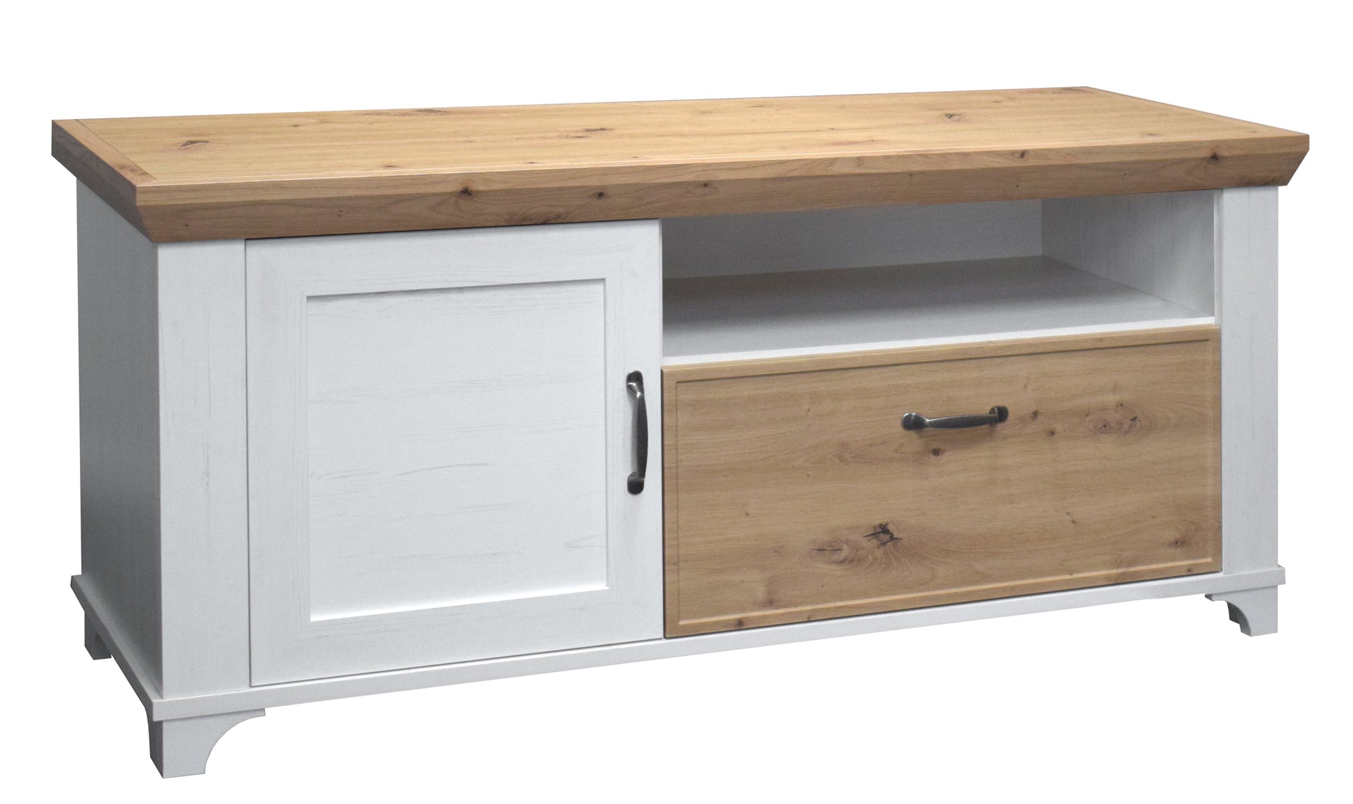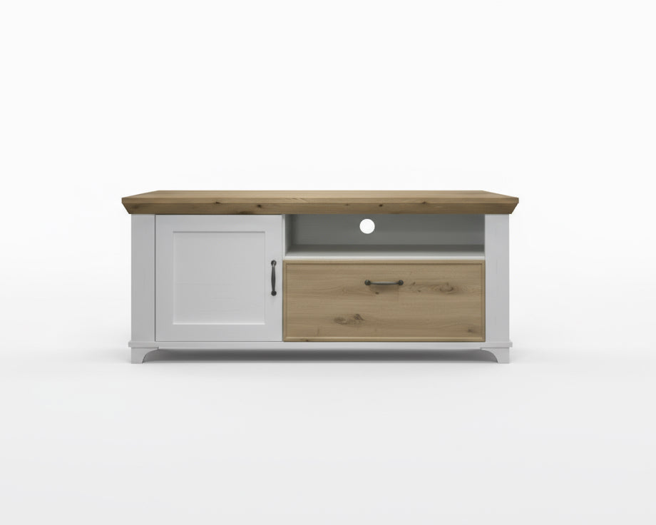 Dank praktischer Aufteilung mit Türen, Schublade und offenem Gerätefach bietet das Lowboard nicht nur Charme, sondern auch ausreichend Stauraum für Technik, Zubehör und Alltagsgegenstände.