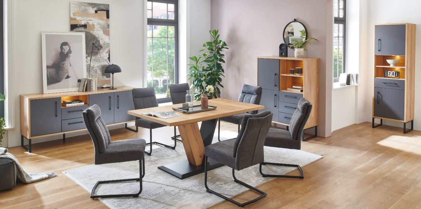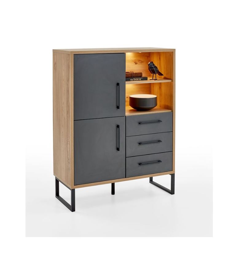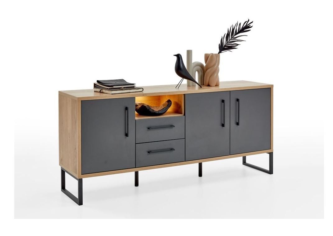 Ein besonderes Merkmal der Möbelstücke sind die naturnahen 3-D-Relief-Oberflächen, welche Tiefe und Struktur verleihen. Für eine angenehme Handhabung sind die Türbänder sowie die Schubkastenführungen gedämpft, sodass sie sich leichtgängig und geräuscharm öffnen und schließen lassen. Die Designgriffe und das Kufengestell in Metall schwarz, verleiht den Möbelstücken eine moderne und elegante Note.