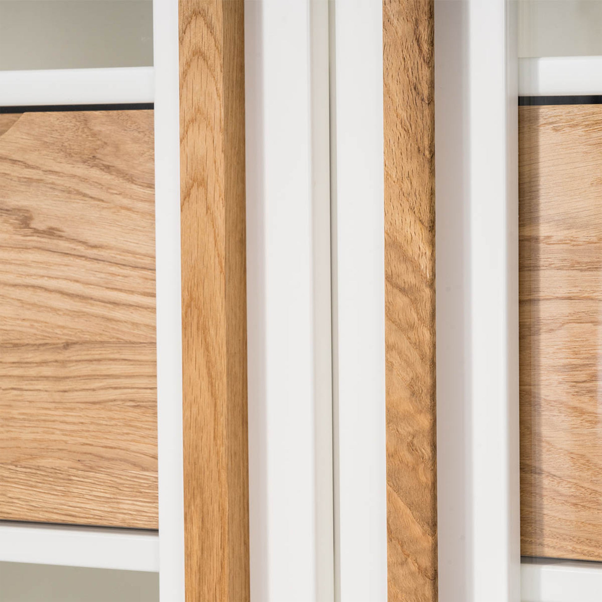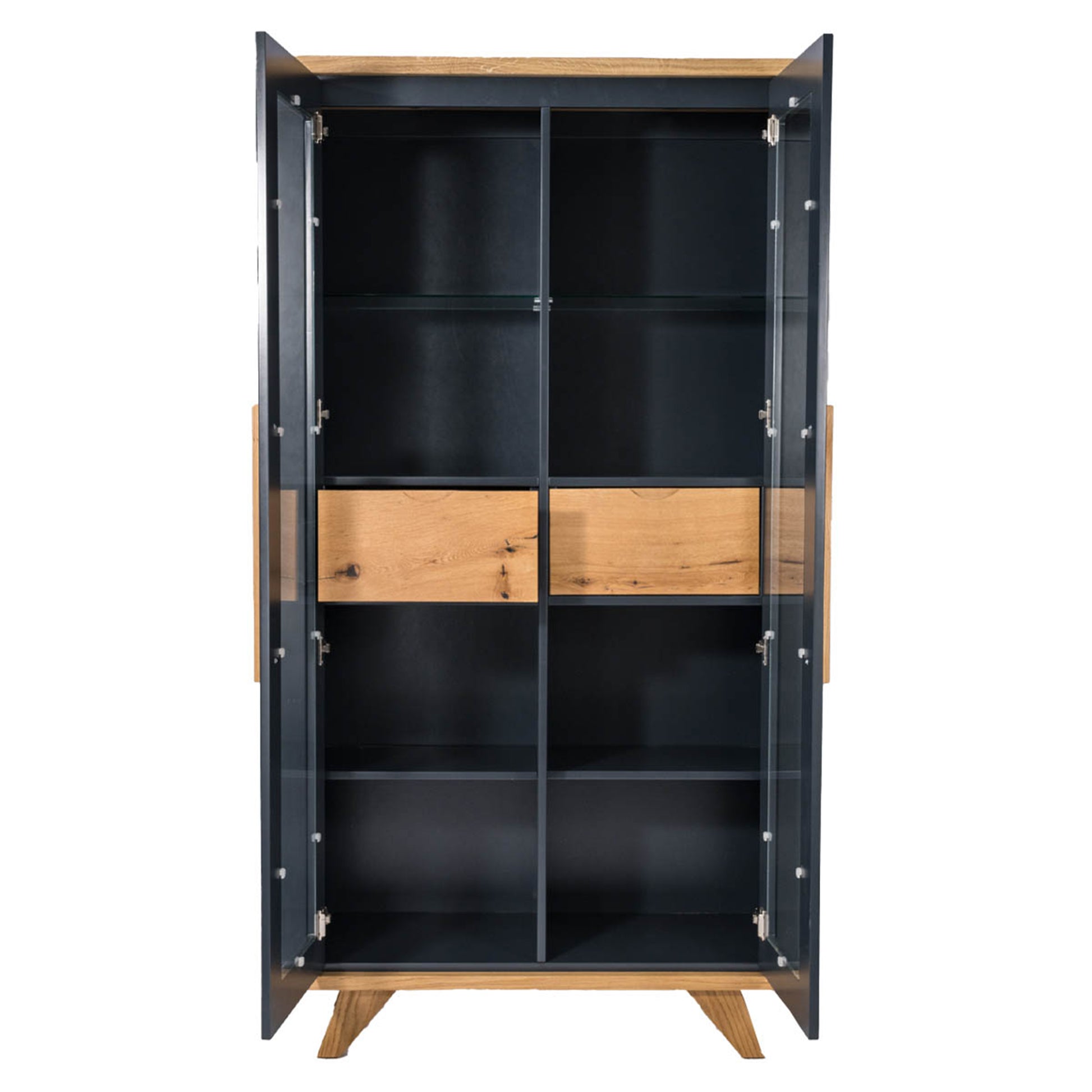 Hinter den zwei Glastüren offenbart sich ein durchdachtes Innenleben mit mehreren Fächern und zwei zentral platzierten Schubladen. Hier findet alles seinen Platz – von Lieblingsdeko bis zum feinen Porzellan.